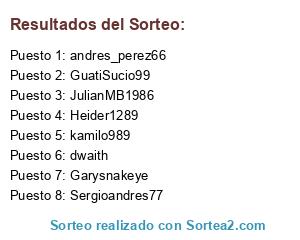 Lista de participantes: kamilo989, Heider1289, dwaith, Sergioandres77, GuatiSucio99, andres_perez66, JulianMB1986, Garysnakeye.