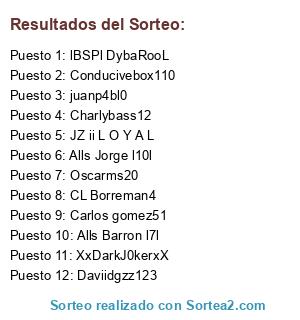 Lista de participantes: juanp4bl0, Daviidgzz123, Alls Jorge l10l, Carlos gomez51, lBSPl DybaRooL, JZ ii L O Y A L, Alls Barron l7l, CL Borreman4, Charlybass12, Conducivebox110, XxDarkJ0kerxX, Oscarms20.