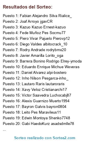 Lista de participantes: Fede Muñoz Pes Socmu77, Edwin Montoya Shenko7748, Alexis Guarnizo Muerto1994, Adrian Rojo Pes Adrian_ifc_cai, Nicolas Maccio Nicolasmaccio, Rodry Andrade rodrybmx20, Luis Antonio Carrasco Nuñez Luis_2611, Kazuo Kazuo Ernest-kazuo, Jhonny Jhordano Leon Jhonny021, Ron Cordoba rcordobacr, Bayron Galvis bayron0804, Joaf Arroyo jgavCR, Leito Pes Maravileus11, Gabi HaedoKurz asadsdmlle78, Marcelo Gutierrez uygames-0004, Xavy Veloz Cristianarchi17, Eric Ocaranza Flores Goodemborg, Lautaro Raris lautaroraris, Daniel Cordova Kingcoca593, Diego Valdes albitocrack_10, Andrey Bogantes AndreyBogantes, Javier Amarilla Lorito_oga, Victor Saavedra Luchocabj87, Inho Nilson Pesgarca-inho_, Daniel Alvarez alpi-bostero, Barrera Bonino Rodrigo Elrey-ymoda, Mario Gonzales Torres MarioDGT, Kevin Pes Demntor10, Piero Vivar Pajuelo Pierovp12, Fabian Alejandro Silva Rialice_, Hugo Adrian Leguizamon Zero_1983_, Eduardo Enrique Michue Weveras, José Angel Chavarria Chino_96CR, Luis Jhonathan Salazar jhona_Kra.