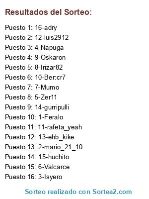 Lista de participantes: 1-Feralo, 2-mario_21_10, 3-Isyero, 4-Napuga, 5-Zer11, 6-Valcarce, 7-Mumo, 8-Irizar82, 9-Oskaron, 10-Ber:cr7, 11-rafeta_yeah, 12-luis2912, 13-ehb_kike, 14-gurripulli, 15-huchito, 16-adry.