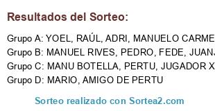 Lista de participantes: MANUELO CARMELO, MARIO, MANUEL RIVES, PEDRO, PERTU, AMIGO DE PERTU, IVÁN, JUANJO, MANU BOTELLA, YOEL, FEDE, ADRI, RAÚL, JUGADOR X.