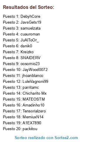 Lista de participantes: samuelzata, parritamc, danik0, MemiuxN14, DebyhCore, JavsGets19, MATEOSTM, JuAlToOr_, oosornio23, Amadinho10, SNAIDERV, A1EX7890, Kreizko, packitou, Chicharito Mx, JayWood0072, jhoanblanco, Tensorialzero, LuleVagnoni99, cuauroman.