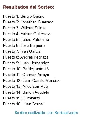 Lista de participantes: Andres Pedraza, Sergio Osorio, Jose Baquero, Felipe Paternina, Willmar Zuleta, Simon Agudelo, Juan Bernal, Ivan Garcia, German Arroyo, Juan Camilo Mendez, Juan Hernandez, Fabian Gutierrez, Anderson Pico, Jonathan Guerrero, Humberto, Participante 16.