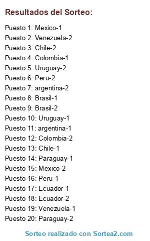 Lista de participantes: argentina-1, argentina-2, Colombia-1, Colombia-2, Chile-1, Chile-2, Uruguay-1, Uruguay-2, Ecuador-1, Ecuador-2, Peru-1, Peru-2, Brasil-1, Brasil-2, Venezuela-1, Venezuela-2, Paraguay-1, Paraguay-2, Mexico-1, Mexico-2.