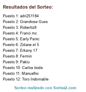Lista de participantes: Pakiu, Zidane el 5, Carlos bode, Fermin, Manuelho, Toro Indomable, Grandiose Guss, Erkany 17, Early Panic, Franci mc, Robertiz8, adri251184, .