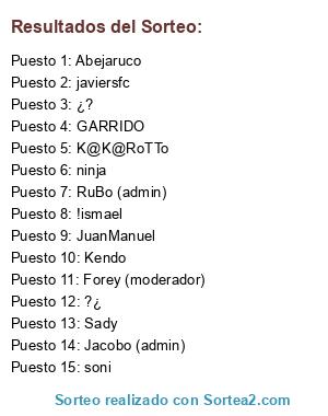 Lista de participantes: RuBo (admin), Kendo, Forey (moderador), !ismael, K@K@RoTTo, ninja, Sady, Abejaruco, JuanManuel, javiersfc, soni, GARRIDO, Jacobo (admin), ¿?, ?¿.