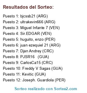 Lista de participantes: juan ezequiel 21 (ARG), bjcssb21 (ARG), Djan Andrey (CRC), PJSR16 (GUA), ultrakevin666 (ARG), Miguel Infante 7 (VEN), Freddy V Sagas (GUA), Joseph. Guardiola (PER), huguito, enzo (PER), CarlosCa15 (CRC), Sir.EDGAR (VEN), Kevitic (GUA).