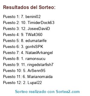 Lista de participantes: 1. ramonsucu, 2. Lupal22, 3. gonhiSPK, 4. NataelArkangel, 5. ArSenn95, 6. Marianomaida, 7. benini02, 8. edumatarife, 9. TWalt360, 10. TimiderDock63, 11. ringedstarfish7, 12. JoseeDaviiD.