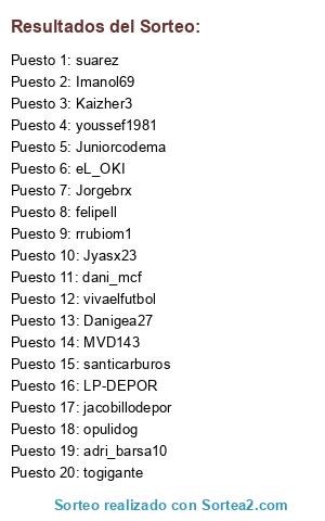 Lista de participantes: eL_OKI, Danigea27, togigante, rrubiom1, opulidog, Jorgebrx, Kaizher3, Juniorcodema, felipell, Jyasx23, MVD143, vivaelfutbol, santicarburos, suarez, adri_barsa10, jacobillodepor, LP-DEPOR, dani_mcf, Imanol69, youssef1981.