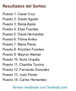 Lista de participantes: Benja Ayala, Krizztian Fuentes, Fidme Aviles, Mayron Aleman, Fernando Gonzalez, Mario Perez, Elias Fuentes, Carlos Hernandez, Juan Flores, Chamba Turcios, Danilo Aguilar, Cesar Cruz, David Hernandez, Boris Urquilla.