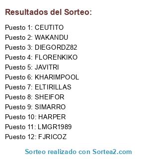 Lista de participantes: CEUTITO, DIEGORDZ82, ELTIRILLAS, FJRICOZ, FLORENKIKO, HARPER, JAVITRI, KHARIMPOOL, LMGR1989, SHEIFOR, SIMARRO, WAKANDU.
