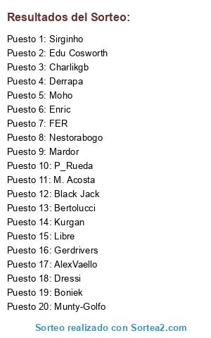 Lista de participantes: Black Jack, Munty-Golfo, Nestorabogo, Derrapa, Mardor, Edu Cosworth, Dressi, Charlikgb, Gerdrivers, AlexVaello, Sirginho, Bertolucci, Moho, FER, Kurgan, P_Rueda, M. Acosta, Enric, Boniek, Libre.