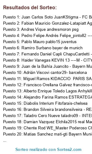 Lista de participantes: Boris AcUña Pereira Boris_azul25--bayern munich, Brandon Silveira brandonsilveira - REAL MADRID, Marcelo Seifert matadero2015 real madrid, Russo Carlos Ariel russitooo - real madrid, Chente Rod WE_Master Poderoso Chelsea, Alejandro Farina Ramos ESTRATEGA , LIVERPOOL, Damian Vazquez Elchila2015 real Madrid xd, Fabian Mauricio Gonzalez-Latapiatt Aguilar Kist - psg, Ramiro Surbano bayer de munich, Criz Tiann cris15 bayer, Luis Torres Venezuelapower PSG, Rodrigo Juarez rodrigo2024 ----- Sampdoria, Ookiio DjProducer Ookiio! - Juventus, Da Ri Fegrva Davigolxd...... Bayer munich, Andres Vique andresmoron psg, Jorge Meler JORGE-RIVER M. CITY, Francisco Orellana Galvez francisco-cabj-real madrid, Gabril Mesinguer MICHINGA2014-BAYERN MUNICH, Adrián Viscovi cantor29- barcelona, Christopher Rodriguez Silva totomet1986 bayern, Juan de la Bahía Juancito - Bayern Munich, Jano Santiago JanitoY2J - Real madrid, Oscar Barrera Okcito-barcelona, Matias Sanchez mati-gti Bayern Munich, Pablo Mauro pablo15 juventus, Diabolis Interium Fitofarais-chelsea, Juan Cruz Tabasso CABJjuan - Benfica, Taladro Cero Nueve taladro09 - INTER MILAN, Arku Pes arku - Boca Juniors, Jhonny García Jhojagaca --Soy Barcelona, Miguel Ramos KIDACCIO PARIS SAINT GERMAIN, Damian Sanchez Pintos Damiansan Man UTD, Fernando Daniel Capli ChapuCardetti - River Plate, Pedro Felipe Andrés Felipe_pinto82 ------- juventus, Mauro Sanchez Kurilin .... Banfield, Pablo Mojica Mou27 - manchedter u, Juan Carlos Soto JuanKStigma - FC Bayern, Sebastian Luque Seba2015 real Madrid, Haider Vanegas KEVIN 13 ----M - CITY, Federico Compaired fedinho - barcelona, Emaiden Pes E-mAiDeN - Barça, Mauro Luciano maurolucianoman- psg, Alberto Enrique Toledo Lagos Anhykiller - Juventus, Lucas Leonardo Fernandez Lk20 Roma.