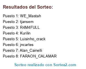 Lista de participantes: FARAON_CALAMAR, Luisinho_crack, Kurilin, tjansem, jncartes, WE_Mastah, Alan_Cainelli, R4M4FULL.