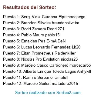 Lista de participantes: Marcelo Seifert matadero2015, Sergi Vidal Cardona Elprimodepego, Nicolas Pro Evolution nicolas23, Lucas Leonardo Fernandez Lk20, Alberto Enrique Toledo Lagos Anhykiller, Brandon Silveira brandonsilveira, Emaiden Pes E-mAiDeN, Ramiro Surbano ramafull, Rodri Zamora Rodrii271, Marcelo Casco Carbonero marcecarbonero, Eitan Prometheus Raidenkiller, Pablo Mauro pablo15.