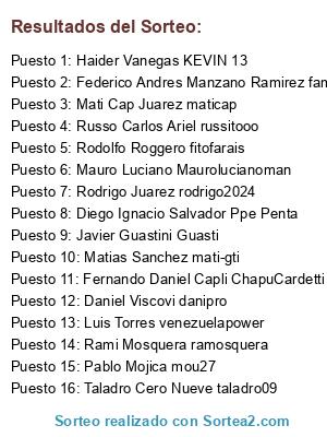 Lista de participantes: Mauro Luciano Maurolucianoman, Taladro Cero Nueve taladro09, Rodrigo Juarez rodrigo2024, Diego Ignacio Salvador Ppe Penta, Rodolfo Roggero fitofarais, Russo Carlos Ariel russitooo, Pablo Mojica mou27, Luis Torres venezuelapower, Javier Guastini Guasti, Matias Sanchez mati-gti, Fernando Daniel Capli ChapuCardetti, Haider Vanegas KEVIN 13, Mati Cap Juarez maticap, Rami Mosquera ramosquera, Federico Andres Manzano Ramirez famr1989, Daniel Viscovi danipro.