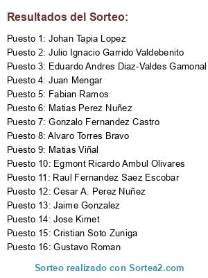 Lista de participantes: Matias Perez Nuñez, Gonzalo Fernandez Castro, Jose Kimet, Gustavo Roman, Fabian Ramos, Johan Tapia Lopez, Alvaro Torres Bravo, Eduardo Andres Diaz-Valdes Gamonal, Matias Viñal, Raul Fernandez Saez Escobar, Cristian Soto Zuniga, Cesar A. Perez Nuñez, Juan Mengar, Jaime Gonzalez, Julio Ignacio Garrido Valdebenito, Egmont Ricardo Ambul Olivares.