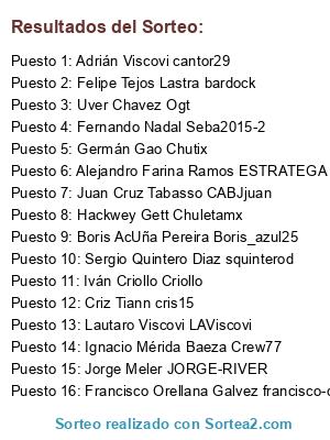 Lista de participantes: Juan Cruz Tabasso CABJjuan, Adrián Viscovi cantor29, Uver Chavez Ogt, Lautaro Viscovi LAViscovi, Hackwey Gett Chuletamx, Felipe Tejos Lastra bardock, Germán Gao Chutix, Boris AcUña Pereira Boris_azul25, Criz Tiann cris15, Alejandro Farina Ramos ESTRATEGA, Iván Criollo Criollo, Francisco Orellana Galvez francisco-cabj, Ignacio Mérida Baeza Crew77, Fernando Nadal Seba2015-2, Jorge Meler JORGE-RIVER, Sergio Quintero Diaz squinterod.