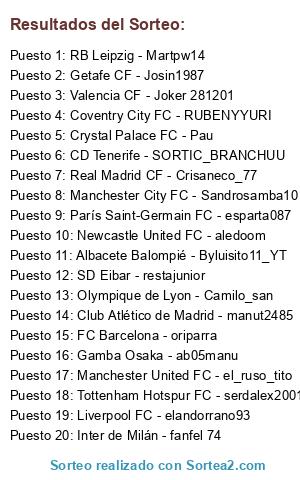 Lista de participantes: Albacete Balompié - Byluisito11_YT, CD Tenerife - SORTIC_BRANCHUU, Club Atlético de Madrid - manut2485, Coventry City FC - RUBENYYURI, Crystal Palace FC - Pau, FC Barcelona - oriparra, Gamba Osaka - ab05manu, Getafe CF - Josin1987, Inter de Milán - fanfel 74, Liverpool FC - elandorrano93, Manchester City FC - Sandrosamba10, Manchester United FC - el_ruso_tito, Newcastle United FC - aledoom, Olympique de Lyon - Camilo_san, París Saint-Germain FC - esparta087, RB Leipzig - Martpw14, Real Madrid CF - Crisaneco_77, SD Eibar - restajunior, Tottenham Hotspur FC - serdalex2001, Valencia CF - Joker 281201.