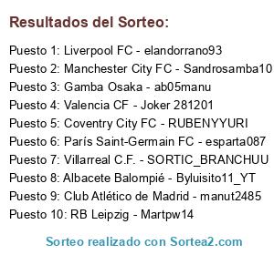 Lista de participantes: RB Leipzig - Martpw14, Manchester City FC - Sandrosamba10, Gamba Osaka - ab05manu, París Saint-Germain FC - esparta087, Albacete Balompié - Byluisito11_YT, Liverpool FC - elandorrano93, Valencia CF - Joker 281201, Villarreal C.F. - SORTIC_BRANCHUU, Club Atlético de Madrid - manut2485, Coventry City FC - RUBENYYURI.