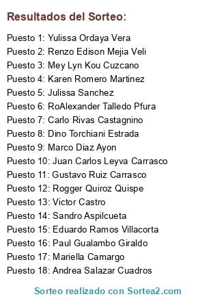Lista de participantes: Andrea Salazar Cuadros, Dino Torchiani Estrada, Evelyn Durand Ricales, Eduardo Ramos Villacorta, Flor Bustos, Jino Olivera Rudas, Luis Alberto Chang Uribe, Marco Diaz Ayon, Paul Gualambo Giraldo, RoAlexander Talledo Pfura, Carlo Rivas Castagnino, Dante Portal Pinedo, Edith Rocio Vargas Zevallos, Gustavo Ruiz Carrasco, Juan Carlos Leyva Carrasco, John Llona Diaz, Jonathan Mori Bustos, Jorge Ortega, Julissa Sanchez, Karen Romero Martinez, Mariella Camargo, Mey Lyn Kou Cuzcano, Ronny Luis Jurado Ala, Renzo Edison Mejia Veli, Sandro Aspilcueta, Victor Castro, Yessica Renee Guardamino Vera, Yulissa Ordaya Vera, Rogger Quiroz Quispe.