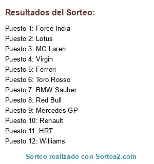 Lista de participantes: Red Bull, MC Laren, Ferreri, Mercedes GP, Renault, Force India, Williams, BMW Sauber, Toro Rosso, Lotus, HRT, Virgin.