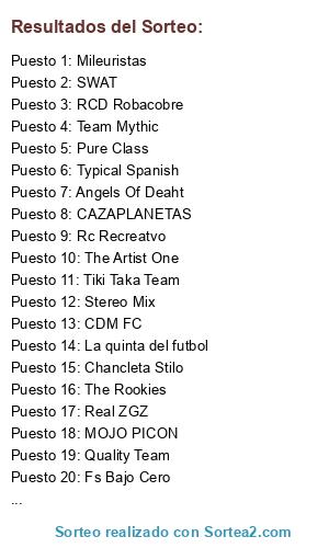 Lista de participantes: Pure Class, The Artist One, Fs Bajo Cero, Rc Recreatvo, RCD Robacobre, Esta tobuena, Tiki Taka Team, CDM FC, Team Mythic, Evolution Flynet, MOJO PICON, CAZAPLANETAS, EL Arca de Noe, Inazuma Eleven, La quinta del futbol, The Rookies, Stereo Mix, Quality Team, Angels Of Deaht, Chancleta Stilo, SWAT, Mileuristas, Real ZGZ, Typical Spanish.