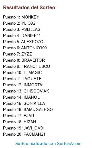 Lista de participantes: EJAR, HIZAN, ALEXPOZO, IAGUETE, YLIO92, PSLILLAS, T_MAGIC, CHISCOVIAK, SAMUGALEGO, ZYZZ, INMORTAL, MONKEY, SONIKILLA, IMANOL, FRANCHESCO, BRAVEITOR, ANTONIO300, PACMAN21, DANIEE11, JAVI_OV91.