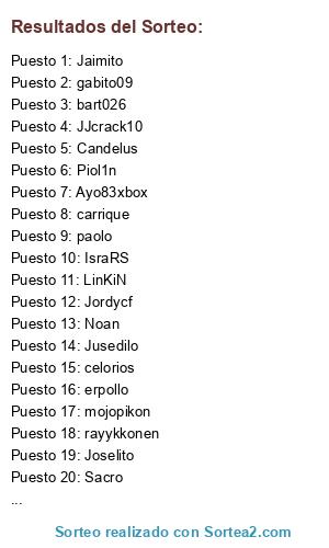 Lista de participantes: paolo, TNT Borracheras, Pantic, mojopikon, Sacro, bart026, Piol1n, celorios, JJcrack10, Ayo83xbox, rayykkonen, Jusedilo, carrique, LinKiN, gabito09, Jordycf, xtian33, erpollo, Jaimito, Joselito, Candelus, Malaguista4, IsraRS, Noan, Droigner.