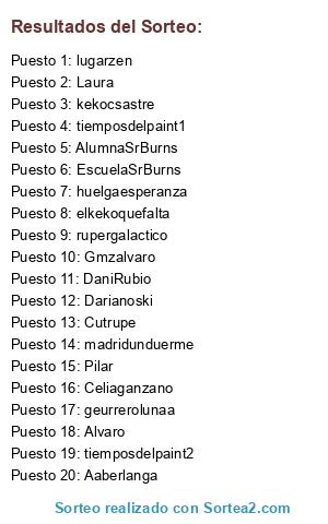 Lista de participantes: Laura, Alvaro, Aaberlanga, AlumnaSrBurns, Gmzalvaro, Celiaganzano, Cutrupe, DaniRubio, Darianoski, elkekoquefalta, EscuelaSrBurns, geurrerolunaa, huelgaesperanza, kekocsastre, lugarzen, madridunduerme, rupergalactico, tiemposdelpaint1, tiemposdelpaint2, Pilar.