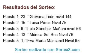 Lista de participantes: 1. Eva María Mascarell Nivel 65, 2. Susana Turon nivel 30, 3. Dennis Murcia Jr nivel 48, 4. Claudia Vaz nivel 60, 5. Ninoska Leañez Fernández Nivel 48, 6. Lola Sánchez Mañani nivel 56, 7. Mónica Jiménez Durán Nivel 55, 8. Osa Mayor Nivel 58, 9. Lola Cerrudo Téllez Nivel 48, 10. Kandace Shanon Wp 35, 11. Gema Fernández Belmonte nivel 57, 12. Yolanda García nivel 61, 13. Mónica Sol Ben Nivel 76, 14. Rucas Castro nivel 66, 15. Luisa Pérez Nivel 75, 16. Vanessa García nivel44, 17. Susana Rodríguez nivel 60, 18. Montchiponchi Po nivel 70 :), 19. Gigi Nery Gutiérrez nivel 43, 20. Tamara Vallejos nivel 51, 21. Isabel de Aguilar NIVEL 42, 22. Enid Mirlay Rodríguez Nivel 85, 23. Giovana León nivel 144, 24. Ddai Dragon Jack. Nivel 66, 25. María Periñán Nivel 48, 26. Graciela Orcellet nivel 81, 27. Sylvia García Godoy nivel 38, 28. Milena Herrera Castillo, 29. Carlos Navarro nivel 63.