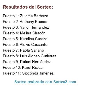 Lista de participantes: Luis Alonso Gutiérrez , Zulema Barboza , Rafael Hernández , Karolina Carazo , Alexis Cascante , Karel Ricica , Yanci Hernández , Anthony Brenes , Gioconda Jiménez , Melina Chacón , Paola Safiano.