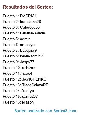 Lista de participantes: admin, Jaspy77, samu237, TiagoSalazaRR, achizam, naxo4, antoniyon, kevin-admin2, Cristian-Admin, Masoh_, Yeri-ye, Cabeeeeee, JAVICHENKO, Ezequiel9, barcelona26, DADRIAL.