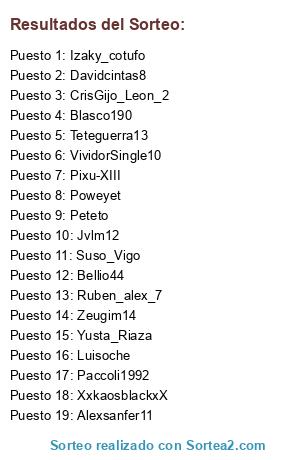 Lista de participantes: Alexsanfer11, Bellio44, Blasco190, CrisGijo_Leon_2, Davidcintas8, Izaky_cotufo, Jvlm12, Luisoche, Paccoli1992, Peteto, Pixu-XIII, Poweyet, Ruben_alex_7, Suso_Vigo, Teteguerra13, VividorSingle10, XxkaosblackxX, Yusta_Riaza, Zeugim14.