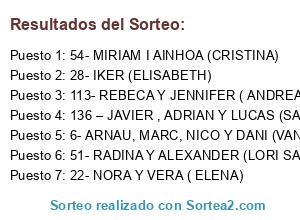 Lista de participantes: 148- ROBERT (RODICA), 130 – NAYARA (GISEL), 144 – JAVIER Y FRANCISCO (MAITE), 047 – AXEL Y ANDER (LORENA), 57- LEYRE, ASIER Y HUGO (MARIBEL), 43 – MARIA Y AINHOA (LOLA), 62- ALEX (NOELIA), 40- ALVARO (MONICA), 147- ATILA (EFRAIN), 41-MANUEL, 145- LEO Y GUILLE (AMPARO), 150-DANIEL (MARIA), 127-LUCIA Y VICTOR, 123 - AARON Y NEREA (VERONICA), 129 – NATALIA (CARMEN), 136 – JAVIER , ADRIAN Y LUCAS (SARA), 81- AITANA (GLORIA), 128 – VERA (CRISTINA), 146 GAEL (NIEVES), 140 – HUGO (SARA), 112 – ELISE (DAVINIA), 8-MARINA Y ADRIAN (JORGE), 85- ALEX Y SU, 9- AARON, 6- ARNAU, MARC, NICO Y DANI (VANESA), 4 – IKER Y ADRIAN (MERCHE), 39- DIEGO (JOANA), 64- MARC (ANA), 28- IKER (ELISABETH), 30- MIA ( ARANCHA), 19- HECOR ( CRISTINA ), 22- NORA Y VERA ( ELENA), 13- NICO Y NOELIA ( DAVIDNIA), 21- CRISTINA (TOMAS), 18 – ALBERTO E IZAN ( GEMA), 33- THAIS (TAMARA), 7- PAUL Y CLARA ( IRENE), 1 – VALENTINA (ANDREA), 10 - ANA ( JUAN), 2- XESCA (SANDRA), 11 – AITOR Y JULEN ( JESSICA), 37- LAIA ( LETICIA), 46 – JESUS Y ANGEL ( JESUS), 29- HUGO (SARA), 38 – HUGO ( SAMANTA), 55- SASHA,ARIS Y LEO ( VICKY), 76 – LENNON (LAURA), 58- PABLO Y MATEO ( ENRI), 68- -JOA Y PAU ( VERA), 69 – EVELINA (CRISTINA), 59- JAZMIN ( JAZMIN), 52- ISABEL (NORMA), 54- MIRIAM I AINHOA (CRISTINA), 51- RADINA Y ALEXANDER (LORI SASHEVA), 66- CESC ( AFRICA ), 71- ANGIE Y NAYARA (ANA), 70- AITANA Y ARNAU (RAQUEL), 63- PABLO Y ALVARO (LIDIA), 60- PABLO Y JULIA ( PAULA), 77- JORGE (GEORGE), 78- MATEO ( DANIELA ), 73 – MATEO (SONIA), 75 – VEGA Y CAYETANA (LETICIA), 83- ALEXIS Y MEGAN (CRISTINA), 74 – IAGO Y AFRICA (RAQUEL), 79 – IRINA ( SILVIA), 91- MARIA EVELIN ( MIRELLA), 94- LUCIA Y ALEJANDRA (ELISABETH), 114 – MIGUEL , AITOR Y ERICK (PEDRO), 113- REBECA Y JENNIFER ( ANDREA), 105 – ZOE ( EVA LLOBELL), 106- SYBELA (REBECA), 102 – MARTINA (ALMA), 152- ERICK (ALBA), 109- AINARA (JANET), 100 – LAIA Y JOAN ( MIRIAM).