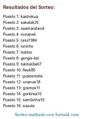 Lista de participantes: ioninho, seamandavid, txistux, rass1984, guazenrafa, romaneli, tukitukibeti7, gramos11, gorkirea10, kastrokua, fleyk85, sambinha10, unanue18, sakatak25, eazula, gengis-kal.