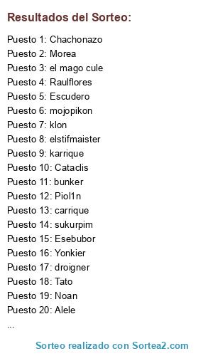 Lista de participantes: JJcrack10, karrique, Piol1n, Chachonazo, Morea, sukurpim, celorios, droigner, klon, juliosr, isra, Noan, Cataclis, Tato, el mago cule, bunker, Yonkier, Raulflores, Escudero, Alele, carrique, Esebubor, elstifmaister, mojopikon.