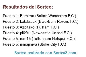 Lista de participantes: rcm15 (Tottenham Hotspur F.C.), ismajimva (Stoke City F.C.), Esmirna (Bolton Wanderers F.C.), pi69tu (Newcastle United F.C.), Azpitako (Fulham F.C.), katakrack (Blackburn Rovers F.C.).