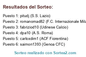 Lista de participantes: pitudj (S.S. Lazio), dpa10 (A.S. Roma), fabriziod10 (Udinese Calcio), saimon1393 (Genoa CFC), carloxdim1 (ACF Fiorentina), romanomad82 (F.C. Internazionale Milano).