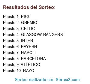 Lista de participantes: GREMIO, ATLETICO, BARCELONA-, INTER, RAYO, BAYERN, CELTIC, PSG, GLASGOW RANGERS, NAPOLI.