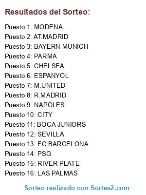 Lista de participantes: AT.MADRID, FC.BARCELONA, BAYERN MUNICH, R.MADRID, NAPOLES, PARMA, SEVILLA, BOCA JUNIORS, RIVER PLATE, ESPANYOL, CHELSEA, M.UNITED, CITY, PSG, LAS PALMAS, MODENA.