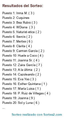 Lista de participantes: Xiito ( 4 ), Montse PM ( 2 ), Mónika Sánchez ( 5 ), Vanessa Jímenez ( 3), Lillibit´s ( 6 ), Neus (8 ), Cuquines (6 participaciones), Raquel Nail´s ( 7 ), Yolanda garcía (9 ), Joanna ( 9 ), Anyol75 ( 6 ), Tirsi ( 4 ), LDDS ( 1 ), Aniña@vamperil ( 6 ), Silvi Manos de árbol ( 7 ), Maite Floriani ( 5 ), Srta. Hedonista ( 1 ), Inma M. ( 3 ), Ginger ( 4 ), Nuria ( 3 ), Regina García Pulido ( 3 ), Angeles ( 5 ), P. Ruiz de Villegas ( 4 ), Clarita ( 4 ), Barrufina Rosa ( 6 ), A la última ( 2 ), Maribel vega ( 2 ), Zaira García ( 7 ), Martha alonso ( 1 ), Noahh ( 9 ), Xandra ( 6 ), Bea Rubio ( 3 ), Mcruza20 ( 2 ), Nerea González ( 4 ), Elenusqui ( 5 ), Trusquiña ( 3 ), Gadiluza ( 1 ), Msevilla ( 5 ), Entremaquillaje ( 6 ), Rosario Pérez ( 5 ), Ruth Chasco ( 3 ), Pero Kate ( 1 ), Irene Vásquez ( 3 ), Ibercis ( 2 ), Marina Sáez ( 2 ), Conmuchaidea ( 4 ), Carmen García ( 2 ), Mertxe ( 6 ), Silvia Bartolomé ( 5 ), Jen López Sánchez ( 2 ), Raquel BS ( 6 ), Aída ( 3 ), Nuria Macias García ( 4 ), Mallirubi ( 4 ), Mistri Desorden ( 3 ), Naturist-etica ( 2 ), Eider Navarro ( 2 ), Mónica Martínez ( 4 ), Miriam Martos ( 1 ), Clara Caballero García ( 4 ), Belswan ( 5 ), Sol y Luna ( 6 ), Irene Merino ( 2 ), María Luisa ( 1 ), Joanna Sr. ( 4 ), Sei ( 2 ), Noxelia ( 2 ), Esther Quintana ( 1 ), Nathy Music Love ( 4 ), Paula R ( 1 ), El tocador de Larissa ( 4 ), Manuela García ( 4 ), Livy ( 5 ), Estelblau ( 1 ), Cristina273 ( 6 ), Laura Sánchez ( 4 ), ;iriam Rodríguez ( 6 ), Patricia ( 2 ), Ladyencarni ( 3 ), Kationa ( 2 ), María Rosa Fdz ( 3 ), Cazoleando ( 2 ), Morales´s Ruth ( 5 ), Esther makeup ( 5 ), Mary Jo ( 5 ), Bichos ( 4 ), Vanessa2112 (1 ), Macarena Soñando con paris ( 6 ), Kela ( 5 ), Pili-La fabulosa Historia ( 6 ), WDiana ( 3 ), Melyssa PG ( 8 ), María González ( 4 ), Veriniquita80 ( 3 ), Patricia Pujol Marton ( 2 ), Huele a Coco ( 4 ), Lentejas1962 ( 4 ), The thin king Cat ( 2 ), M.Carmen santiago ( 3 ), Eva Yoo ( 3 ), Brina Makeup ( 4 ).
