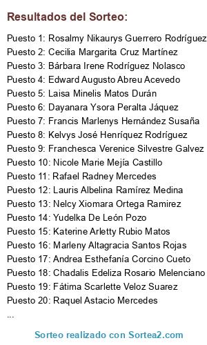 Lista de participantes: Andrea Esthefanía Corcino Cueto, Biannelys Merelyce Martínez Calvo, Chadalis Edeliza Rosario Melenciano, Darvin López, Dayanara Ysora Peralta Jáquez, Emmanuel Anaxímenes López Polanco, Fátima Scarlette Veloz Suarez, Génesis Rodríguez Segura, Haissel Odalissa Uribe Reyes, Hardys Ydalisis Willmore King, Joan Eduardo Rodríguez Cruz, Karina María Colomé Abreu, Katerine Arletty Rubio Matos, Lauris Albelina Ramírez Medina, Luz Mariel Santos Alonzo, Marlon Vladimir Espinosa Lebrón, Nicole Marie Mejía Castillo, Octavia Carolina Fernández Curi, Reymundo Antonio Mejía Zorrilla, Yudelka De León Pozo, Bárbara Irene Rodríguez Nolasco, Carolina de Jesús Abreu Cepeda, Cecilia Margarita Cruz Martínez, Edward Augusto Abreu Acevedo, Franchesca Verenice Silvestre Galvez, Francis Marlenys Hernández Susaña, Job García Hurtado, Johanna Gisselle Reyes Moquete, Karen Gregoria Casado Minyety, Kelvys José Henríquez Rodríguez, Laisa Minelis Matos Durán, Marleny Altagracia Santos Rojas, Misael Isaac Sánchez del Villar, Nelcy Xiomara Ortega Ramirez, Nidia Victoria Jorge Taveras, Rafael Radney Mercedes, Raquel Astacio Mercedes, Rosalmy Nikaurys Guerrero Rodríguez, Sahira Claribel Guzmán Mañán, Wilma Altagracia Puello García.