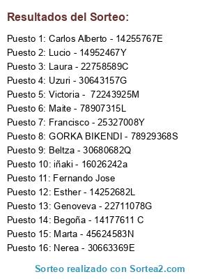 Lista de participantes: Olatz - 78954853Q, Oscar - 30666988F, Esther - 30637572P, iñaki - 16026242a, jokin - 79225218Q, Maria Begoña - 14384247R, Carlos - 14603555G, Uzuri - 30643157G, Juan Felix - 78861771S, Jon - 78916295Y, Maite - 78907315L, Aitor - 44977835R, Jagoba - 78952121K, Francisco - 25327008Y, Francisco - 11915030h, María Cristina - 72026882J, Victoria - 72243925M, Felix - 30611700B, Fernando Jose, Lucio - 14952467Y, Rafael - 72124878Y, Aitor - 45669816g, Amale - 14249944H, Beltza - 30680682Q, Elena - 30600172Y, Monica - 78931653t, Carlos Alberto - 14255767E, Zelai - 78932109L, Marijose - 14574394F, Almudena - 22701820S, Begoña - 14177611 C, Javier - 30598382x, Mª Teresa - 30587807S, Asunción - 30574095b, Amagoia - 16084418n, Marisa - 30565333n, Joseba Iñaki - 72251524Z, Pedro - 20175040S, Rosa María - 14221578B, Mari Carmen - 72254339T, Esther - 14252682L, Begoña - 30564158X, Sofia - 45622924D, Malen - 14897414f, Javier - 30571463R, Maria Isabel - 11906328X, Nerea - 30663369E, Genoveva - 22711078G, María isabel - 14950373M, Jon - 79245416C, Jorge - 30621300c, Ainhoa - 30663318V, Laura - 22758589C, MARIA LUISA - 30692966H, Maria J. - 30580304X, Carlos - 30608080W, Beatriz - 78906495G, Juan Antonio - 14256916K, GORKA BIKENDI - 78929368S, Daniel - 30599521E, Marta - 45624583N.