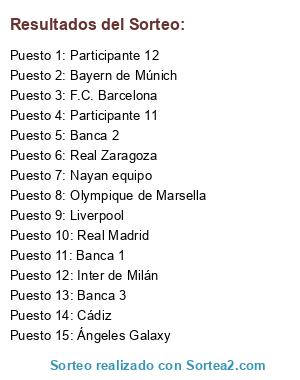 Lista de participantes: Ángeles Galaxy, Olympique de Marsella, Real Zaragoza, Bayern de Múnich, Cádiz, Real Madrid, Nayan equipo, Liverpool, F.C. Barcelona, Inter de Milán, Participante 11, Participante 12, Banca 1, Banca 2, Banca 3.