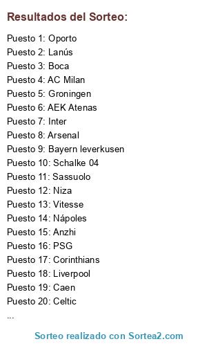 Lista de participantes: Niza, Arsenal, Corinthians, Flamenco, Bayern leverkusen, Boca, AC Milan, Schalke 04, Inter, PSG, Liverpool, Anzhi, River Plate, LOSC Lille, Unión Española, Celtic, Sassuolo, Caen, Oporto, Lanús, Nápoles, AEK Atenas, Vitesse, Groningen.