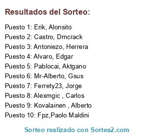 Lista de participantes: Erik, Alonsito, Pablocai, Aktgano, Alvaro, Edgar, Mr-Alberto, Gsus, Antoniezo, Herrera, Fpz,Paolo Maldini, Kovalainen , Alberto, Alexmgic , Carlos, Castro, Dmcrack, Ferrety23, Jorge.