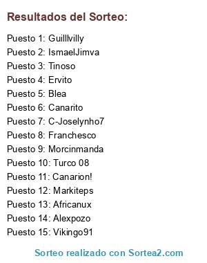 Lista de participantes: Turco 08, Ervito, Markiteps, Canarito, Canarion!, Franchesco, Tinoso, IsmaelJimva, C-Joselynho7, Morcinmanda, Africanux, Alexpozo, Blea, Guilllvilly, Vikingo91.