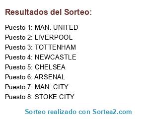 Lista de participantes: CHELSEA, TOTTENHAM, LIVERPOOL, MAN. CITY, MAN. UNITED, NEWCASTLE, ARSENAL, STOKE CITY.