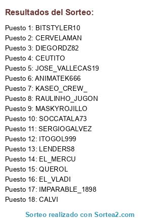 Lista de participantes: ANIMATEK666, BITSTYLER10, CALVI, CERVELAMAN, CEUTITO, DIEGORDZ82, EL_MERCU, EL_VLADI, IMPARABLE_1898, ITOGOL999, JOSE_VALLECAS19, KASEO_CREW_, LENDERS8, MASKYROJILLO, QUEROL, RAULINHO_JUGON, SERGIOGALVEZ, SOCCATALA73.
